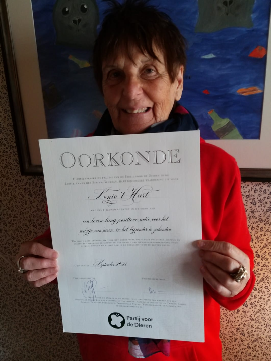 Lenie krijgt oorkonde van de Partij voor de Dieren
