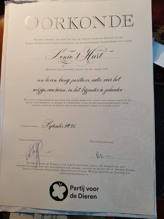 Wat een prachtig cadeau in mijn brievenbus: een oorkonde van de Partij voor de Dieren voor mijn levenswerk voor dierenwelzijn! Daar ben ik hartstikke blij mee, dank!