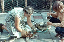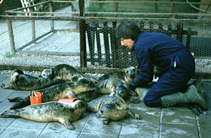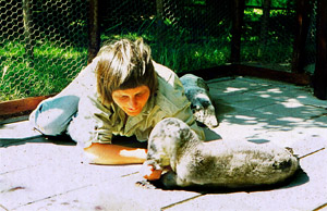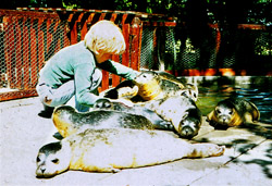 Maar op 21 december 1971 belde Rijkswaterstaat: bij werkzaamheden voor de inpoldering van de Lauwerszee waren ze op een zieke zeehond gestuit. Of ik hem even wilde komen halen. Tja, ik had A gezegd, nu moest ik ook B zeggen. Dus ik in mijn oude eend – met kind achterin – er op af. Ik zie het nog voor me: de grote, stoere mannen schoven de deur van een busje open en daar lag een behoorlijk grote zeehond me aan te kijken. Ik had nog nooit een zeehond vastgehouden, maar ik pakte de zeehond onder de arm en leg hem achterin de eend. Het is ongelofelijk, maar de zeehond beet me niet… Ik groef een wasteil in de tuin en maakte een hekje. Er kwam een dierenarts bij, er werden medicijnen en vis geregeld en na een tijdje kon ik “Loeskus” met de veerboot weer vrijlaten in zee.