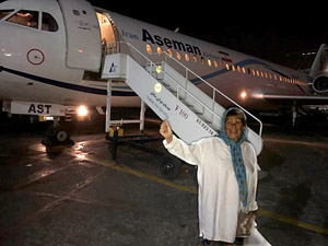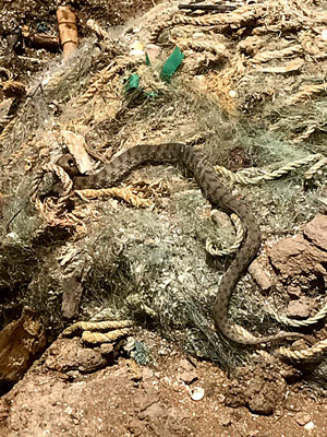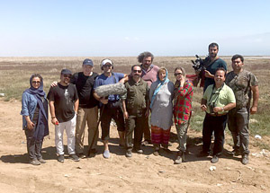 Eén van de dieren die vast zat in zo’n stuk net was een dobbelsteenslang. De visserman verzekerde mij dat hij niet giftig was en niet zou bijten, dus ik heb hem uit het net gehaald en weer in zee losgelaten. Want deze slangen leven in zee en eten vis. We hebben nog even een mooie foto van de hele club gemaakt en toen moesten we op naar het vliegveld: terug naar Teheran. In een Fokker 100!